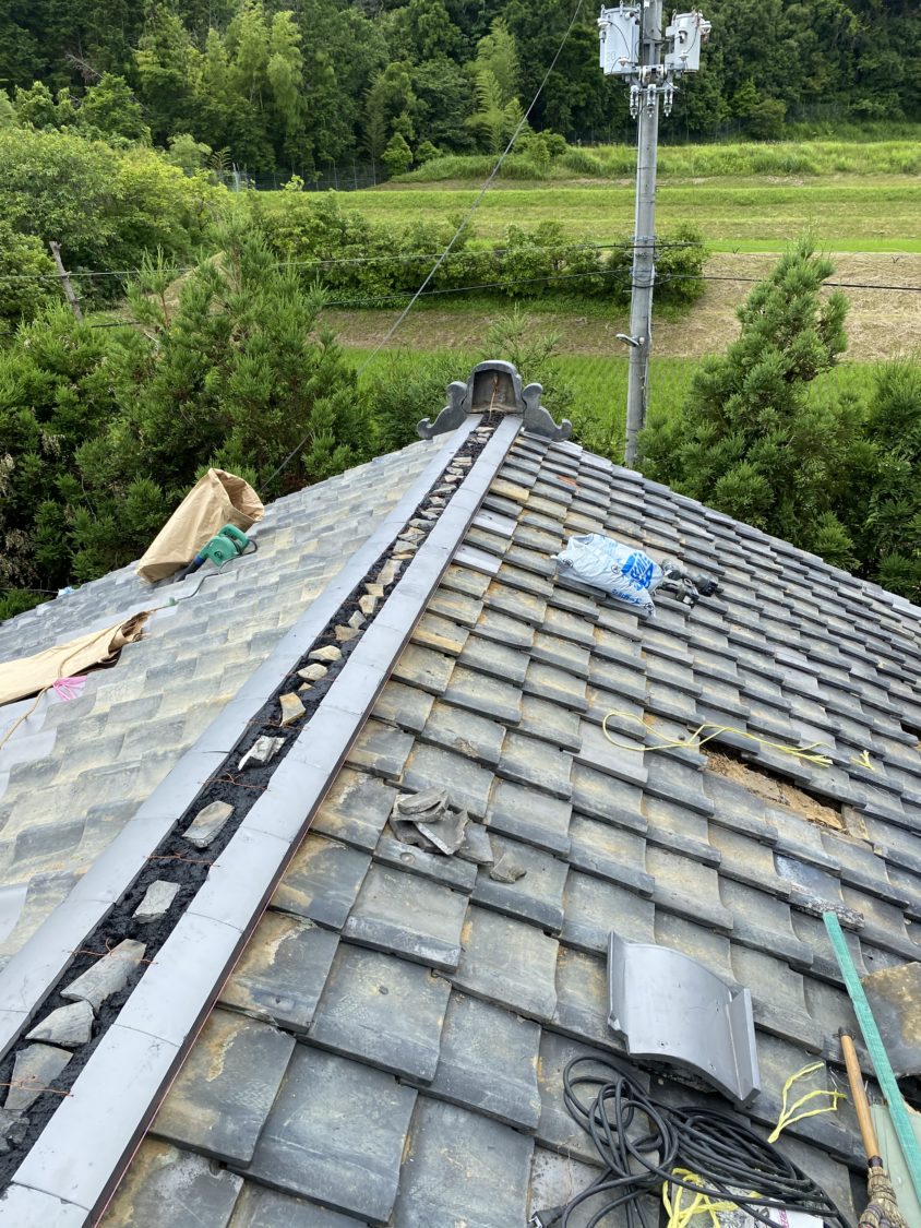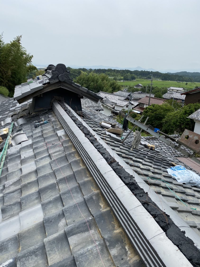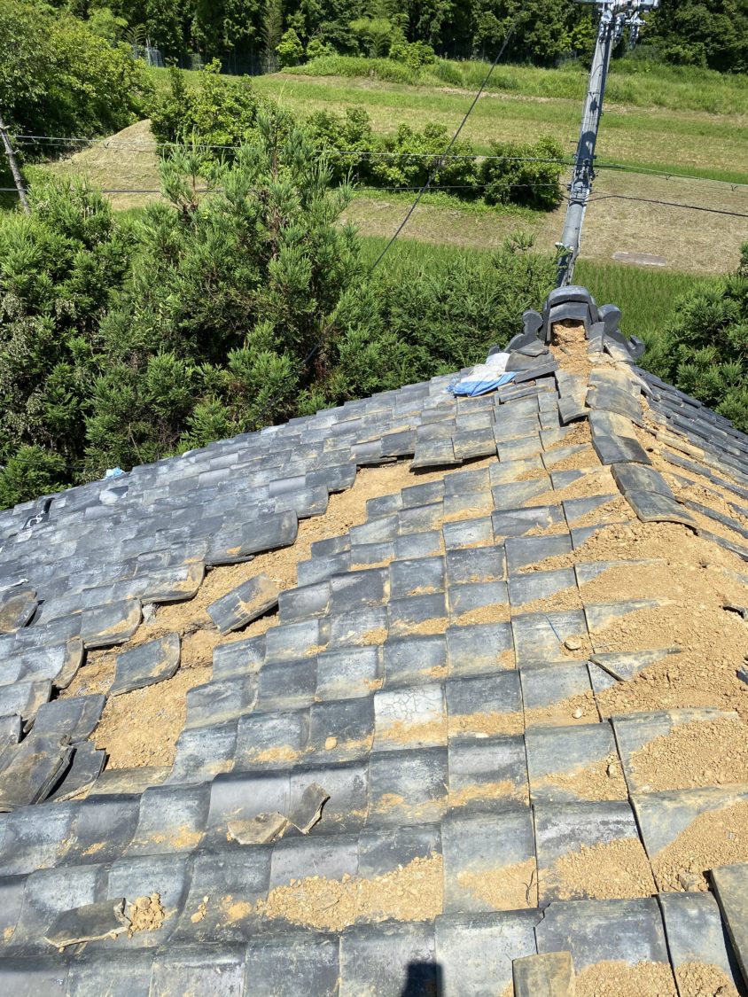 台風による棟部分と平瓦部分の損壊が酷く棟に関しては、ほぼ瓦が飛ばされてなくなり、雨漏れが凄かったそうで、今回は新しく積替え工事をさせて頂きました。