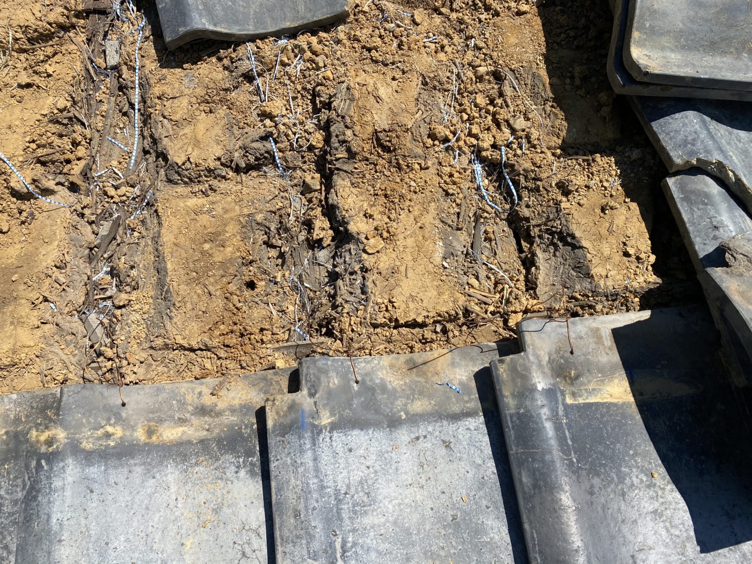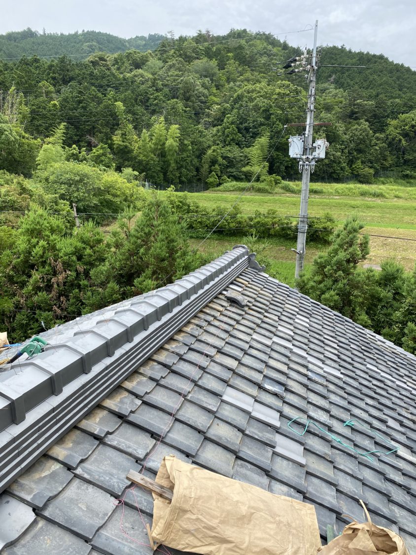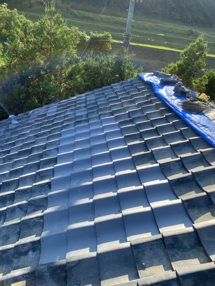 まずは平瓦部分の台風で飛んで行ってしまった瓦や割れている瓦の交換をし、ズレてしまっている部分を突き上げし銅線で結束しズレないように致しました。