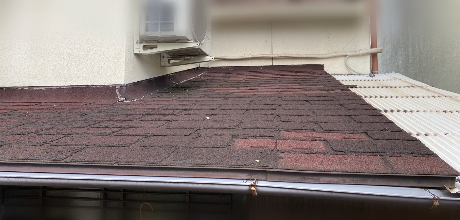 強い雨が降ると天井が濡れてシミになってしまっているとの事でしたので調査した所玄関上のシングル葺きの屋根が捲れたり年数による劣化もありカバー工法での施工をお勧めさせて頂きました。
