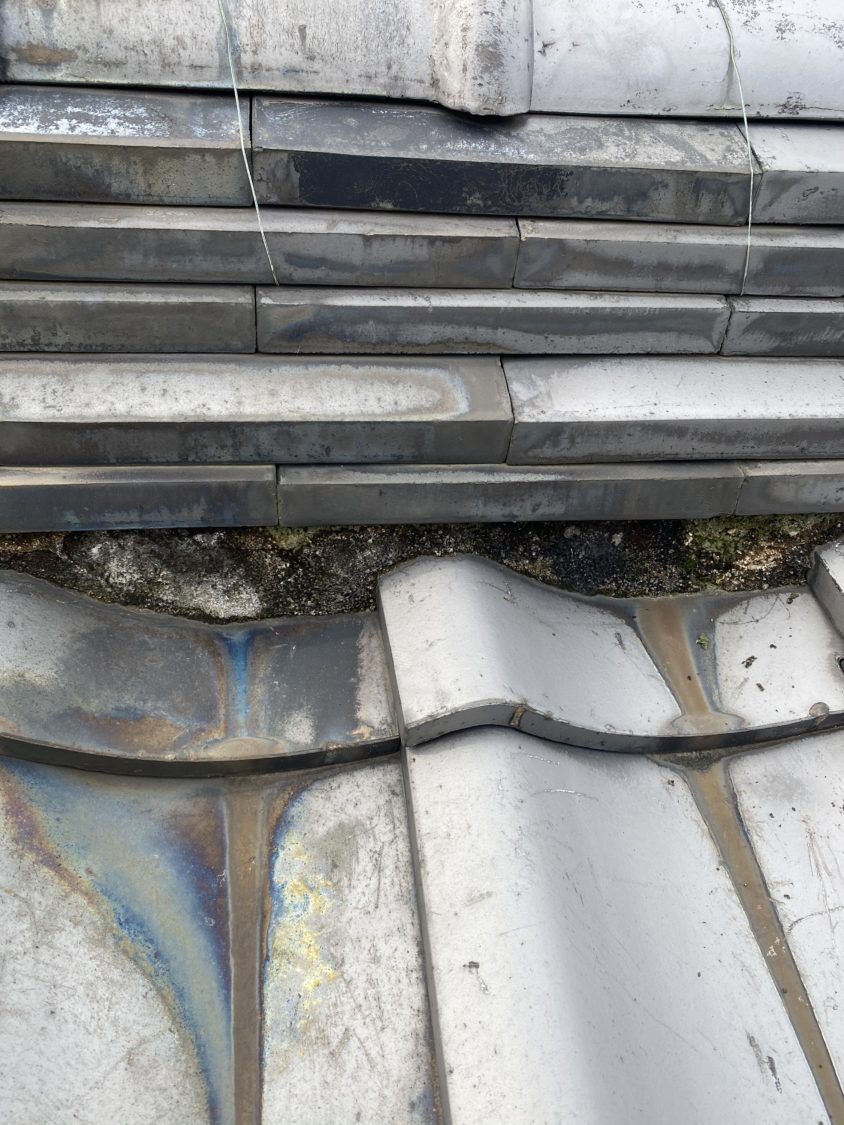 屋根調査をさせて頂いた時に軽く見渡す感じでは雨漏れをするほど瓦の痛みもなく大丈夫そうに見えたのですが、棟の面戸部分が熨斗のつらまで出てきており、熨斗をつたった雨が面戸の中に入ってしまい雨漏れを起こしていたと判断し面戸漆喰の塗り替え工事をご提案させて頂きました。